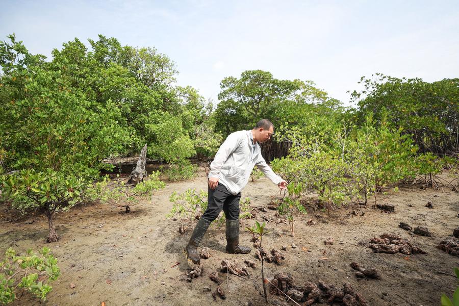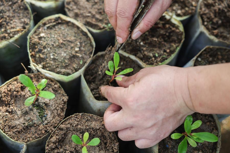 Wang Bingyu, a researcher from Sanya Academy of Forestry, conducts an artificial pollination experiment on a Lumnitzera littorea plant at a greenhouse of the academy in Sanya, south China's Hainan Province, April 10, 2025. (Xinhua/Zhang Liyun)Zeng Dehua, a researcher from Sanya Academy of Forestry, checks a Lumnitzera littorea seedling at Tielu port mangrove nature reserve in Sanya, south China's Hainan Province, April 9, 2025. (Xinhua/Zhang Liyun)Lumnitzera littorea seedlings are pictured at a greenhouse of Sanya Academy of Forestry in Sanya, south China's Hainan Province, April 10, 2025. (Xinhua/Zhang Liyun)Zeng Dehua, a researcher from Sanya Academy of Forestry, transplants a Lumnitzera littorea seedling at a greenhouse of the academy in Sanya, south China's Hainan Province, April 9, 2025. (Xinhua/Zhang Liyun)Wang Bingyu (L), a researcher from Sanya Academy of Forestry, conducts an artificial pollination experiment on a Lumnitzera littorea plant at a greenhouse of the academy in Sanya, south China's Hainan Province, April 10, 2025. (Xinhua/Zhang Liyun)