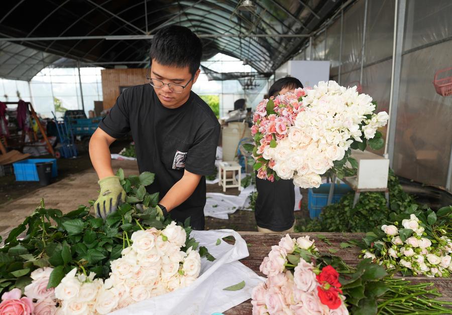 Zhan Juntao (1st R) packs Chinese roses for visitors at a Chinese rose production base in Longyou County, east China's Zhejiang Province, April 22, 2025. (Xinhua/Weng Xinyang)Liu Gang (L) instructs a farmer on picking Chinese roses at a Chinese rose production base in Longyou County, east China's Zhejiang Province, April 22, 2025. (Xinhua/Weng Xinyang)A staff member of a logistics company transports fresh-cut Chinese roses at a Chinese rose production base in Longyou County, east China's Zhejiang Province, April 22, 2025. (Xinhua/Weng Xinyang)
