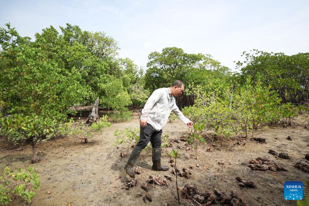 Zeng Dehua, a researcher from Sanya Academy of Forestry, checks a Lumnitzera littorea seedling at Tielu port mangrove nature reserve in Sanya, south China's Hainan Province, April 9, 2025. (Xinhua/Zhang Liyun)