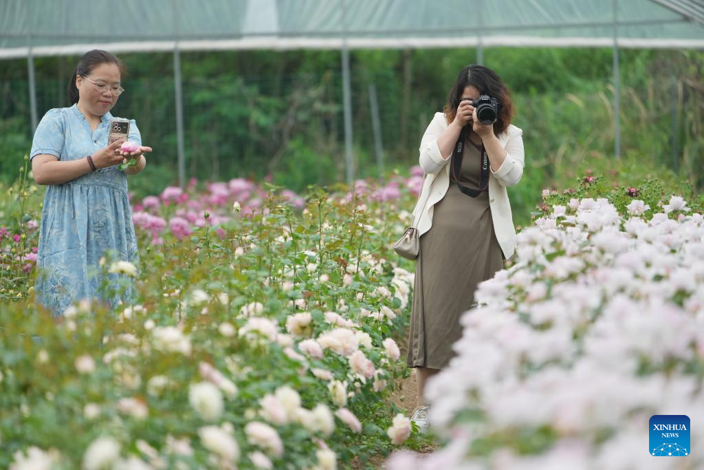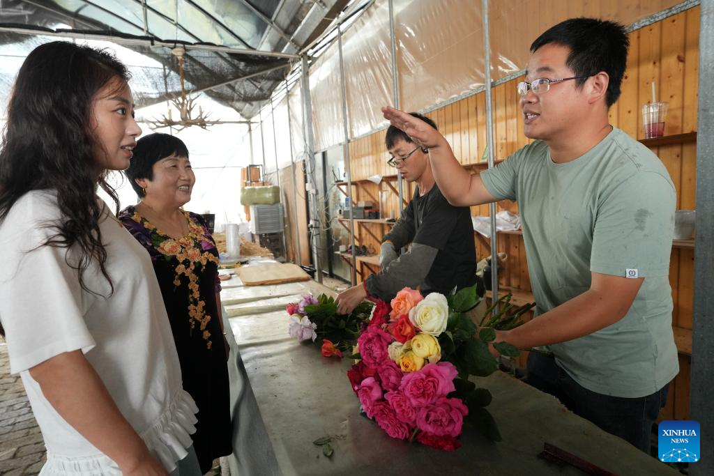 Zhan and Liu now operate two production bases covering a planting area of over 40 mu (about 2.67 hectares), where they grow more than 400 varieties of Rosa Chinensis. They sell fresh-cut flowers through e-commerce platforms and also open the planting base for sightseeing and flower-picking. During flower seasons in spring and autumn, the garden attracts an average of 500 daily visitors, creating annual sales exceeding 2 million yuan (about 273,000 U.S. dollars). The planting base also creates job opportunities for local farmers. (Xinhua/Weng Xinyang)