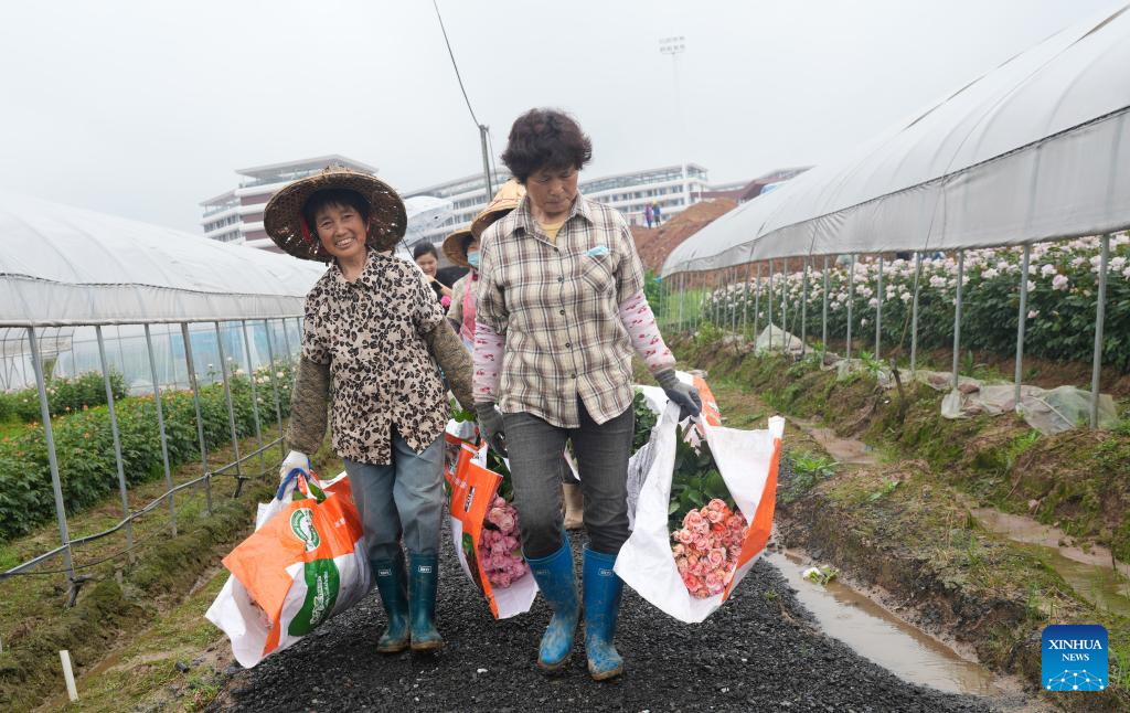 Farmers transport fresh-cut Chinese roses at a Chinese rose production base in Longyou County, east China's Zhejiang Province, April 22, 2025. (Xinhua/Weng Xinyang)