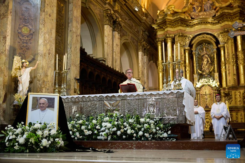 A mass is on going in the Metropolitan Cathedral, where Pope Francis, as Archbishop Jorge Bergoglio, used to perform mass, in Buenos Aires, Argentina, on April 21, 2025. Pope Francis, the 266th pontiff of the Roman Catholic Church, died Monday at the age of 88, said the Vatican in a statement.