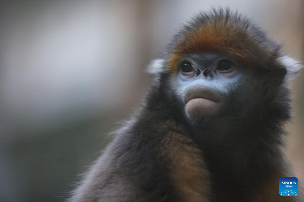 A Guizhou snub-nosed monkey is seen in a Guizhou snub-nosed monkey research center of Mount Fanjing National Nature Reserve in southwest China's Guizhou Province, April 15, 2025. (Xinhua/Ou Dongqu)