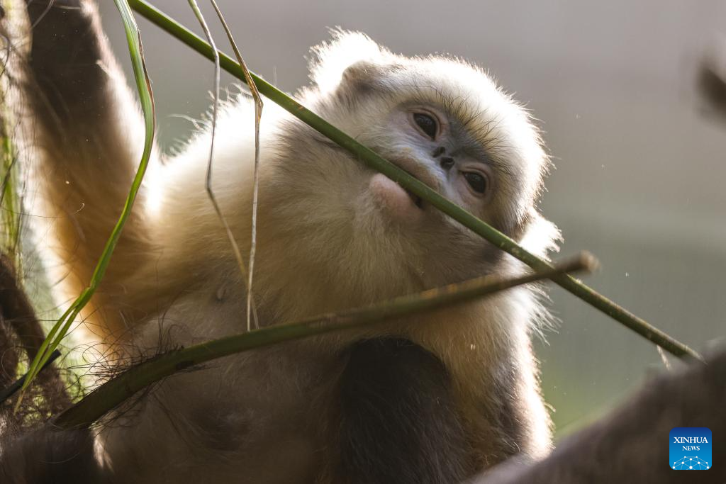 A Guizhou snub-nosed monkey is seen in a Guizhou snub-nosed monkey research center of Mount Fanjing National Nature Reserve in southwest China's Guizhou Province, April 15, 2025. (Xinhua/Yang Wenbin)