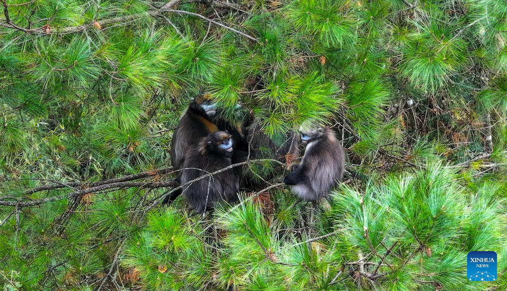 A drone photo taken on Dec. 27, 2024 shows Guizhou snub-nosed monkeys in Mount Fanjing National Nature Reserve of southwest China's Guizhou Province.