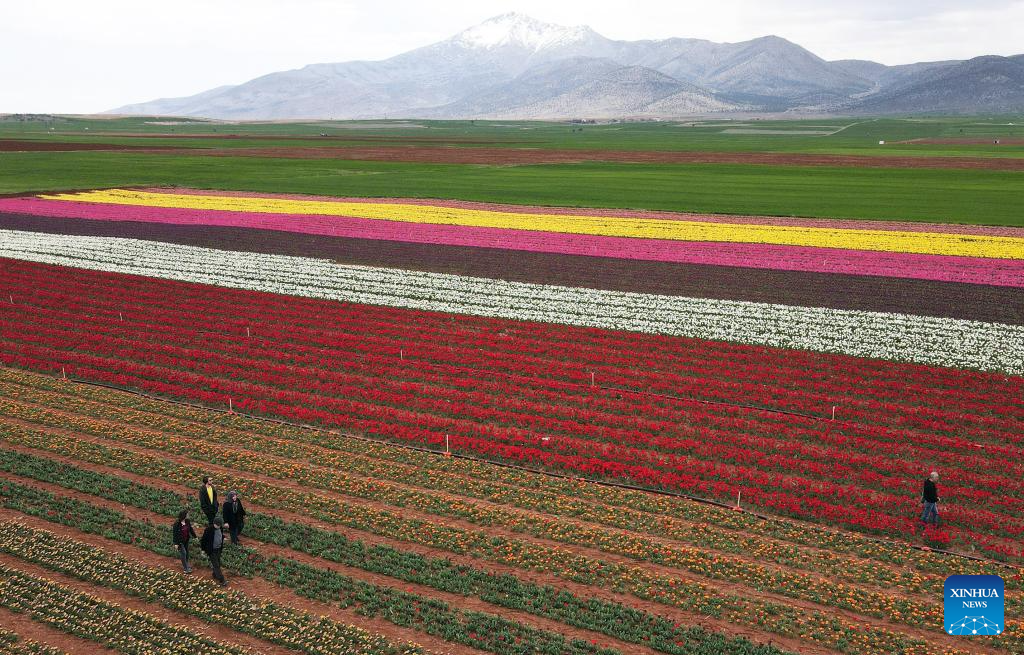 People walk at a field of tulips in Konya, Türkiye, April 21, 2025. (Mustafa Kaya/Handout via Xinhua)
