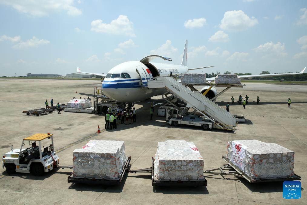 The eighth batch of emergency humanitarian aid supplies dispatched by the Chinese government arrives at Yangon International Airport in Myanmar on April 22, 2025.
