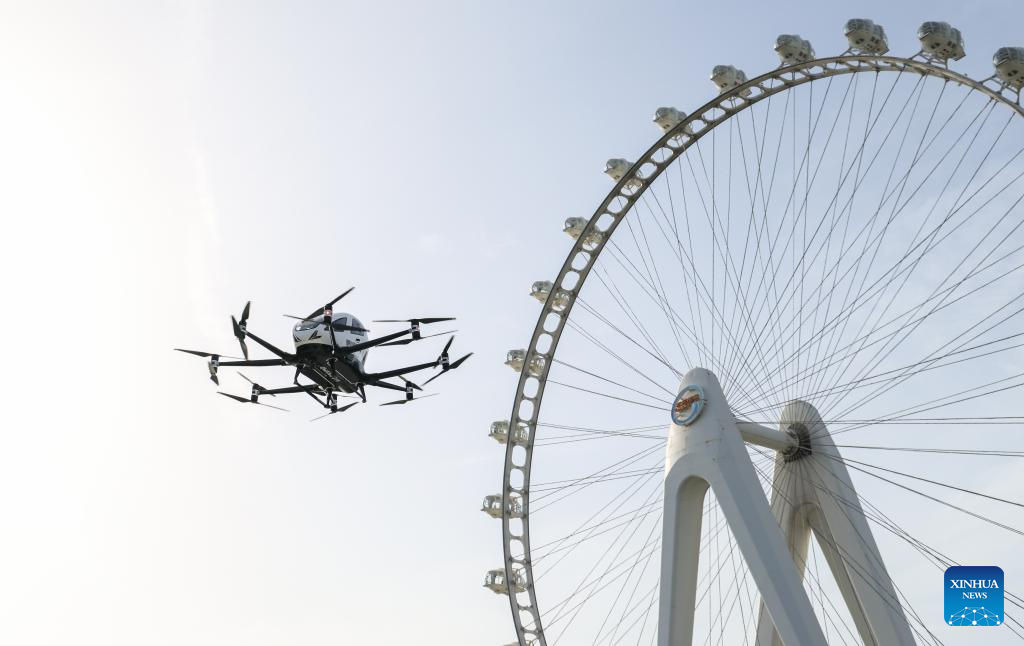 An electric vertical takeoff and landing (eVTOL) aircraft, developed by Chinese drone maker EHang, carries out a demo flight at the urban air traffic operation demonstration center in Bao'an District in Shenzhen, south China's Guangdong Province, April 16, 2025.