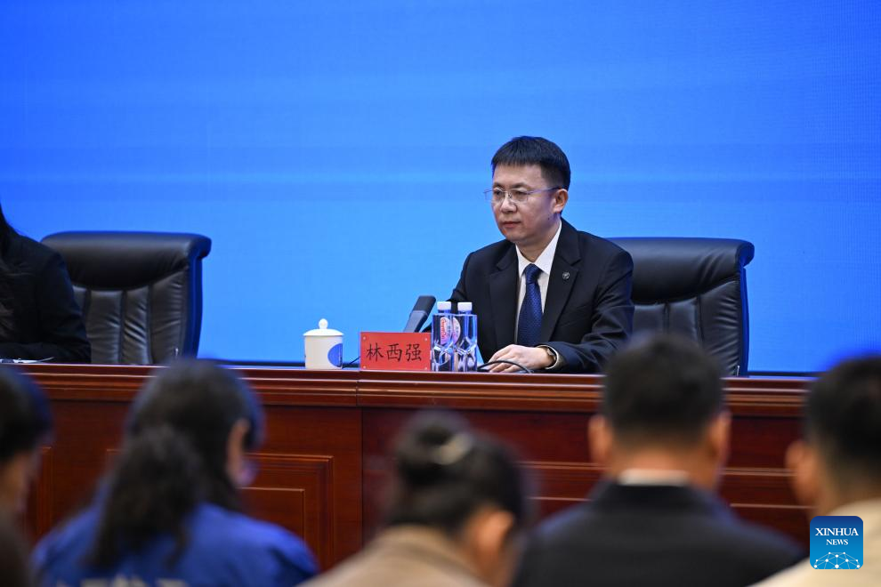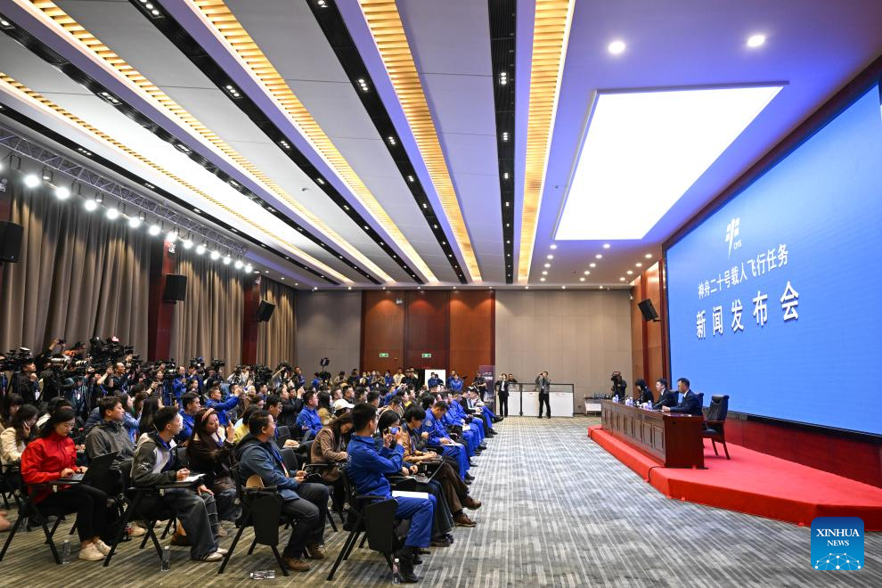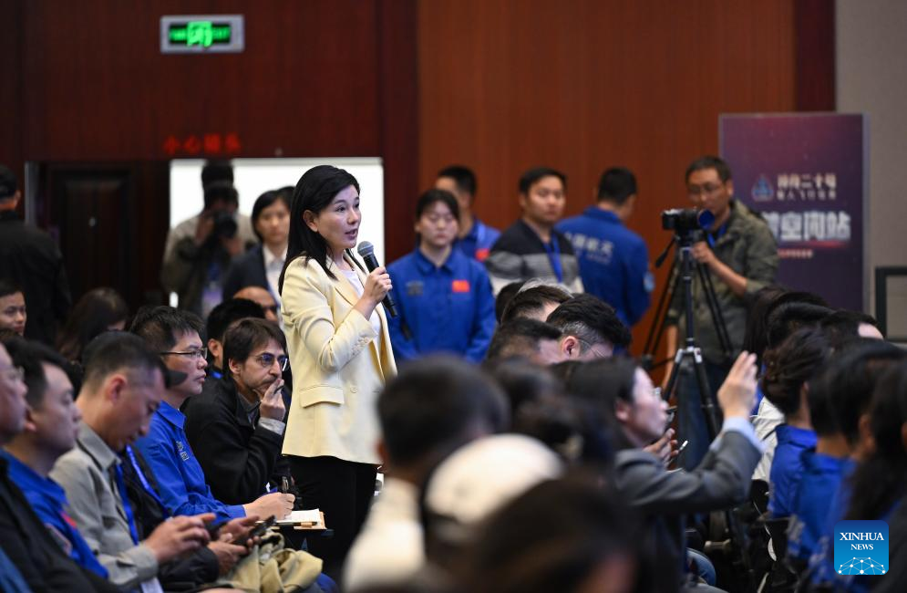 A press conference on the Shenzhou-20 crewed spaceflight mission is held in Jiuquan Satellite Launch Center in northwest China on April 23, 2025. (Xinhua/Ma Jinrui)