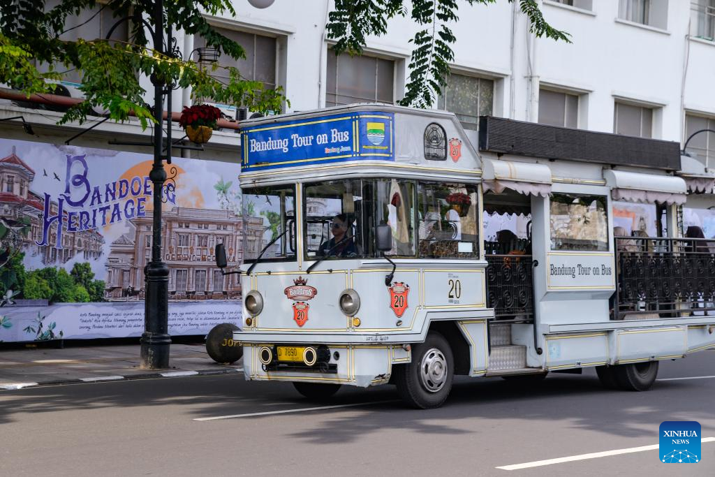 A "Bandung Tour on Bus" vehicle is pictured on Asia Africa Street in Bandung, Indonesia, April 23, 2025. In April 1955, a landmark conference in Indonesia's city of Bandung gathered 29 Asian and African nations under the flag of solidarity, friendship and cooperation, marking the awakening of the part of the world later known as the Global South.