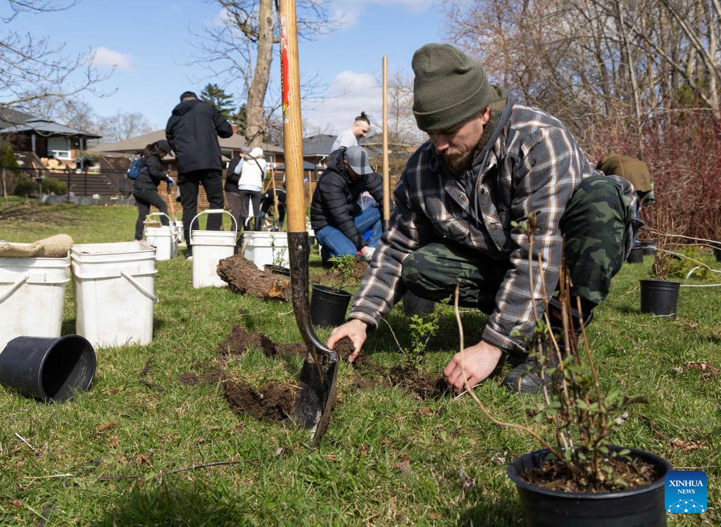 (250422) -- TORONTO, April 22, 2025 (Xinhua) -- A man participates in a tree planting event at a park in Toronto, Canada, on April 22, 2025. About 160 people took part in the tree planting event here on Tuesday to mark Earth Day. (Photo by Zou Zheng/Xinhua)