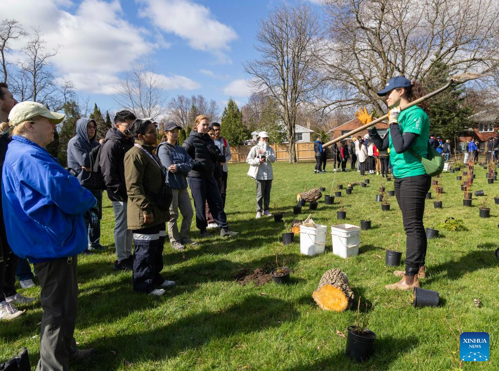 (250422) -- TORONTO, April 22, 2025 (Xinhua) -- People participate in a tree planting event at a park in Toronto, Canada, on April 22, 2025. About 160 people took part in the tree planting event here on Tuesday to mark Earth Day. (Photo by Zou Zheng/Xinhua)