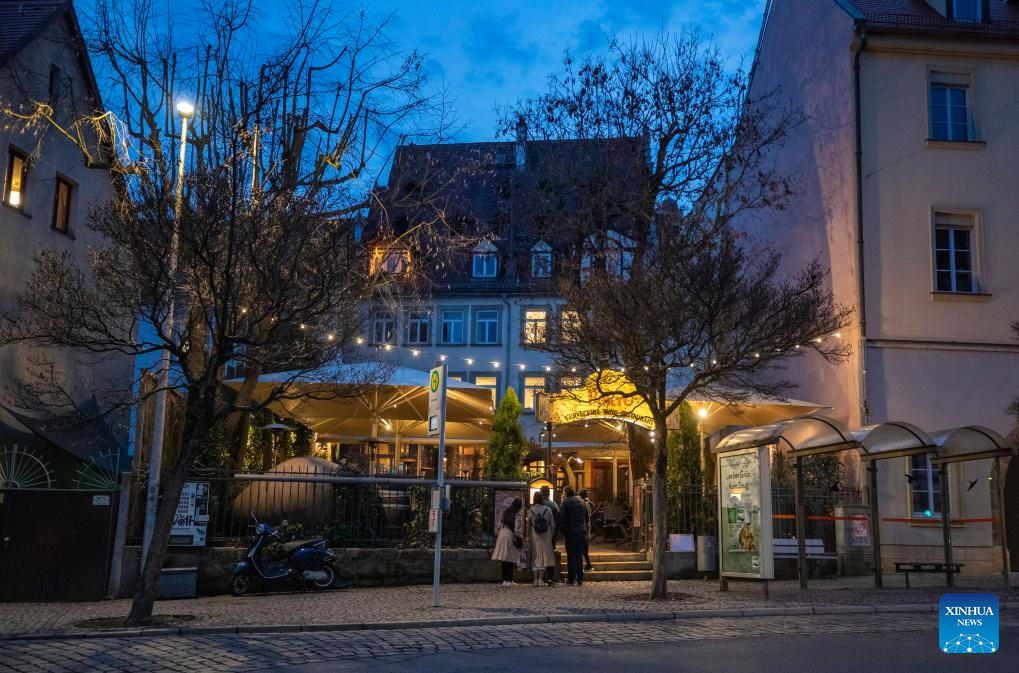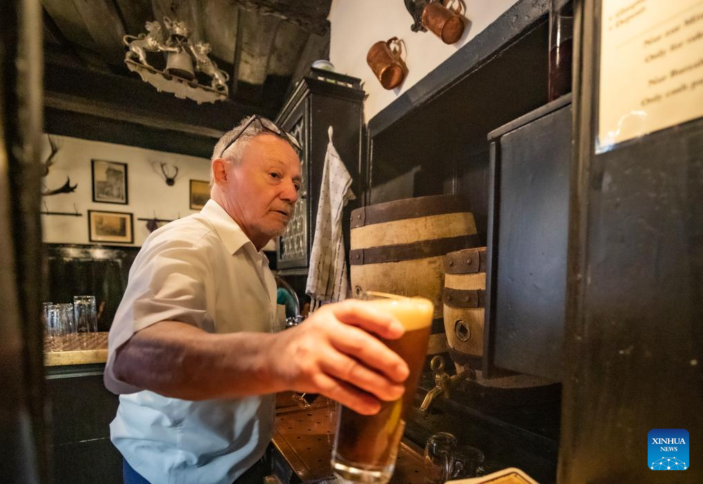 A staff member hands out fresh smoky beer at a restaurant in the ancient town of Bamberg, Germany, March 24, 2025. (Xinhua/Zhang Fan)
