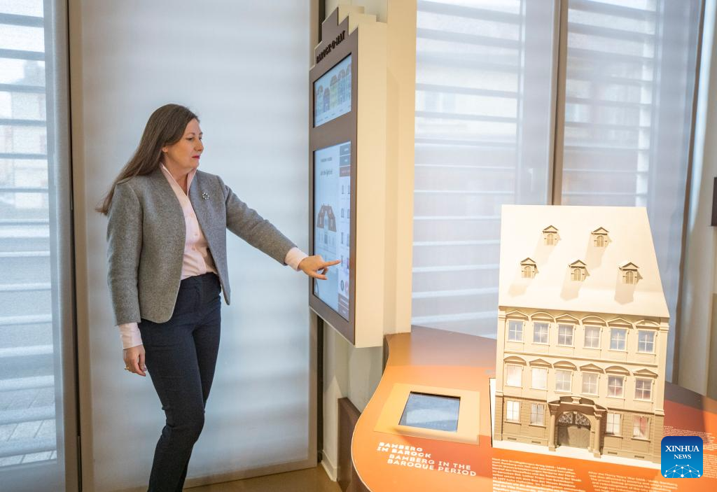 Simona von Eyb, director of the World Heritage Center Bamberg, introduces an interaction device at an exhibition hall of the center in the ancient town of Bamberg in Bavarian state, Germany, March 24, 2025. Bamberg in Germany and Shexian in China show how towns with a remarkable history can thrive today.