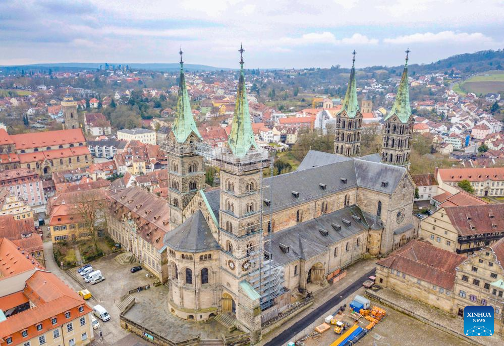 This photo taken on March 24, 2025 shows a view of the Bamberger Dom in the ancient town of Bamberg in Bavarian state, Germany. Bamberg in Germany and Shexian in China show how towns with a remarkable history can thrive today.