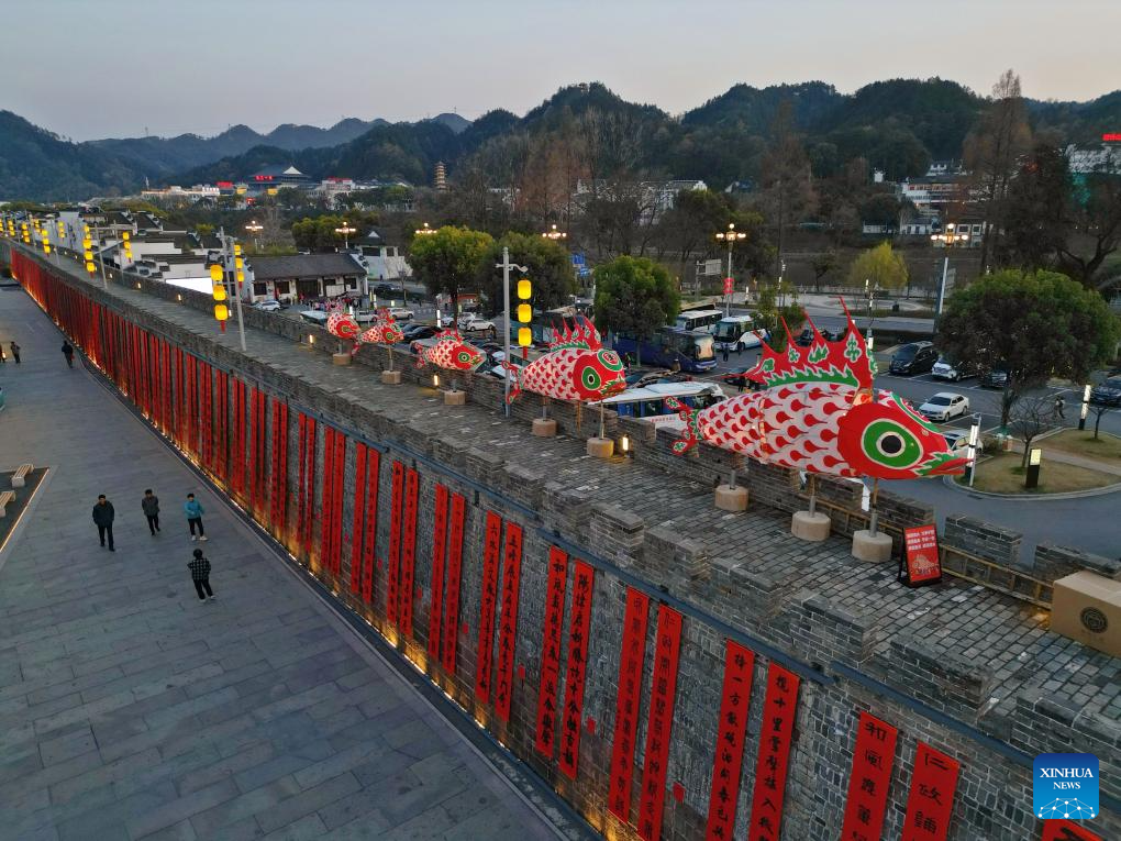 This photo taken on March 19, 2025 shows fish-shaped lanterns on the ancient walls of Huizhou ancient town in Shexian County, east China's Anhui Province. Bamberg in Germany and Shexian in China show how towns with a remarkable history can thrive today.