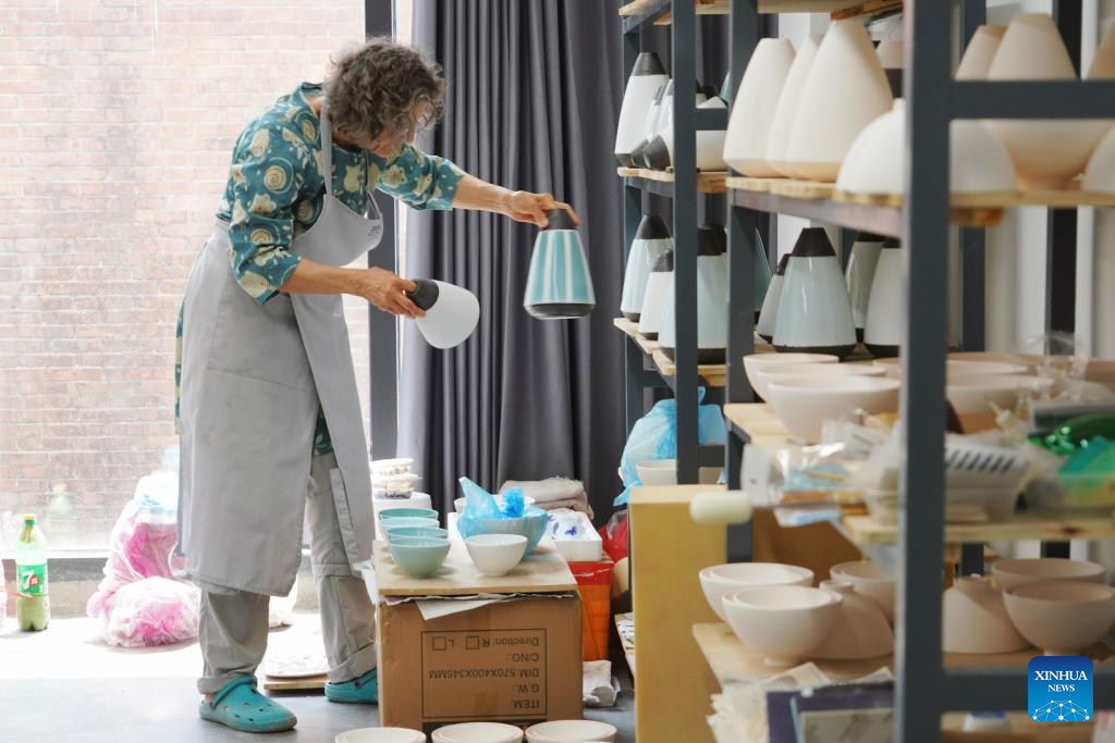 German ceramic artist Karin Flurer-Bruenger shows artwork at her studio at Taoxichuan Ceramic Art Avenue in Jingdezhen, east China's Jiangxi Province, April 8, 2025. (Xinhua/Du Juanjuan)