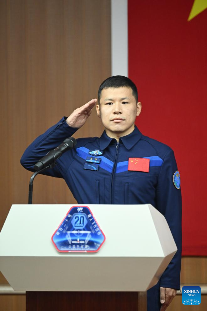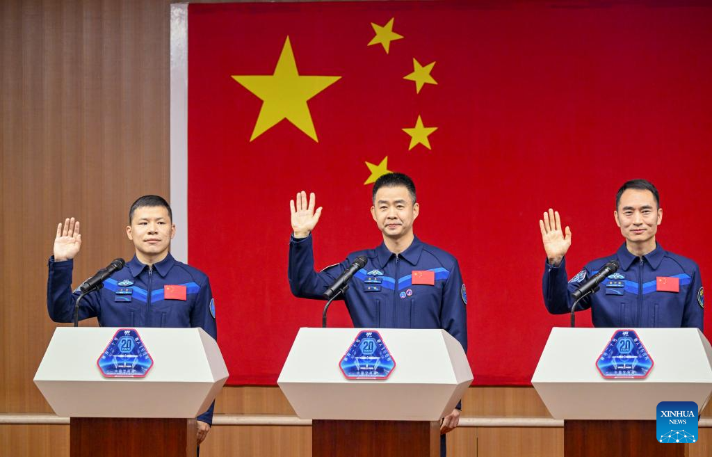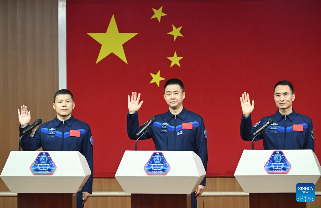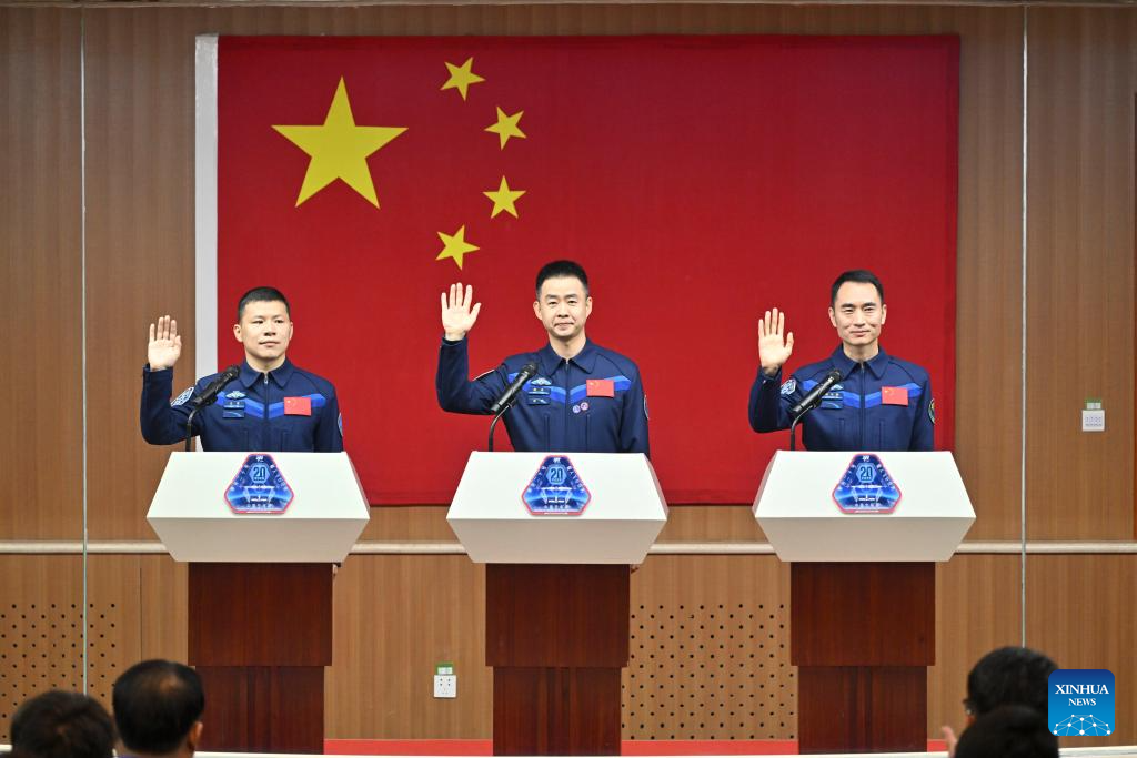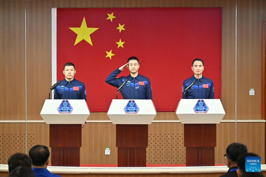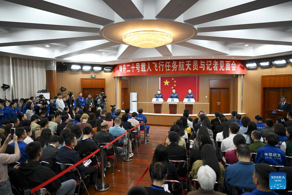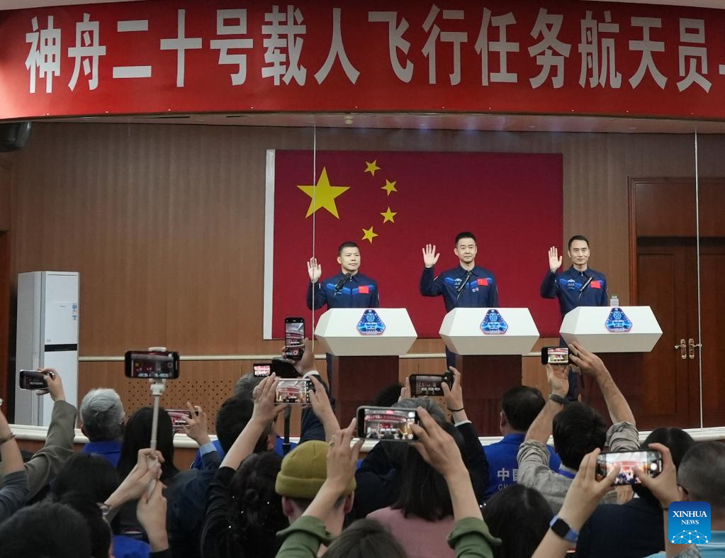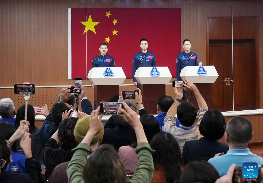 JIUQUAN, April 23 (Xinhua) -- Chen Dong, Chen Zhongrui and Wang Jie, the three Chinese astronauts for the upcoming Shenzhou-20 spaceflight mission, met the press on Wednesday.