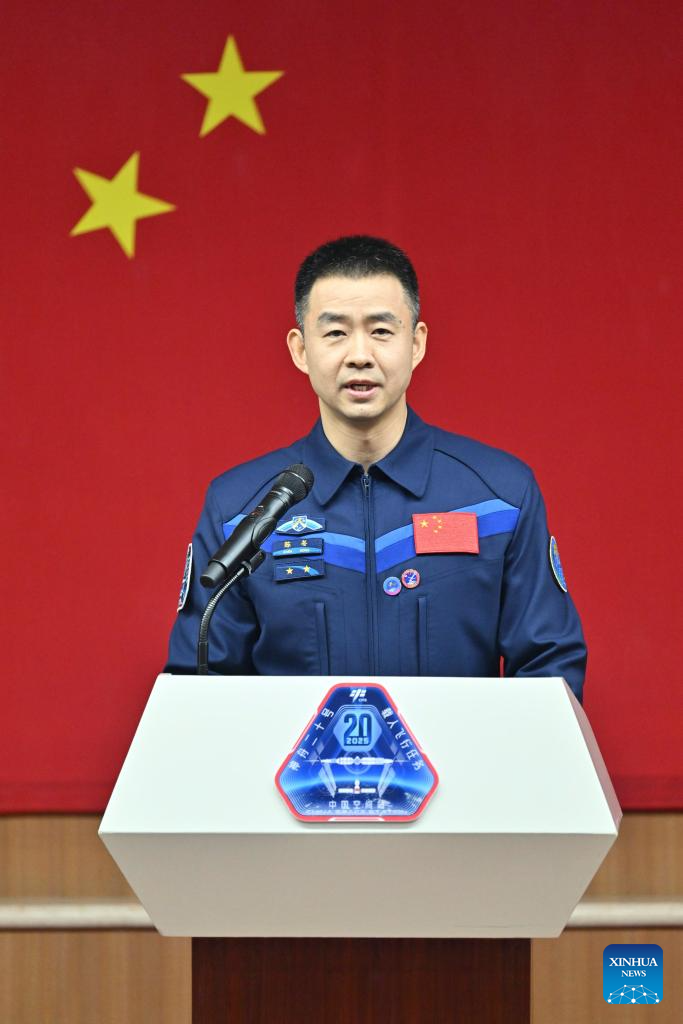 Astronaut for the upcoming Shenzhou-20 spaceflight mission Wang Jie meets the press in Jiuquan Satellite Launch Center in northwest China on April 23, 2025.