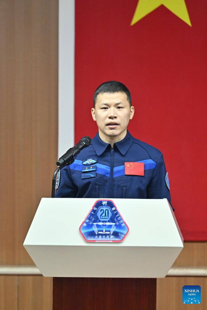 Astronaut for the upcoming Shenzhou-20 spaceflight mission Chen Zhongrui meets the press in Jiuquan Satellite Launch Center in northwest China on April 23, 2025.