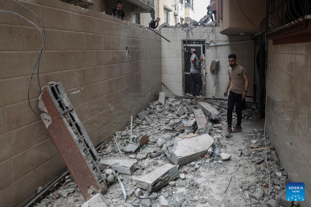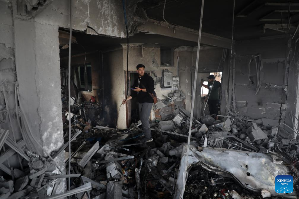 Palestinians inspect a destroyed apartment building after an Israeli airstrike in Gaza City, on April 24, 2025. At least 29 Palestinians were killed on Thursday in multiple Israeli airstrikes across the Gaza Strip, according to Gaza's civil defense. (Xinhua/Rizek Abdeljawad)