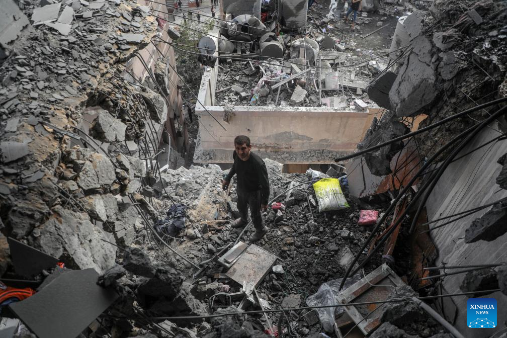 A Palestinian man inspects a destroyed apartment building after an Israeli airstrike in Gaza City, on April 24, 2025. At least 29 Palestinians were killed on Thursday in multiple Israeli airstrikes across the Gaza Strip, according to Gaza's civil defense. (Xinhua/Rizek Abdeljawad)