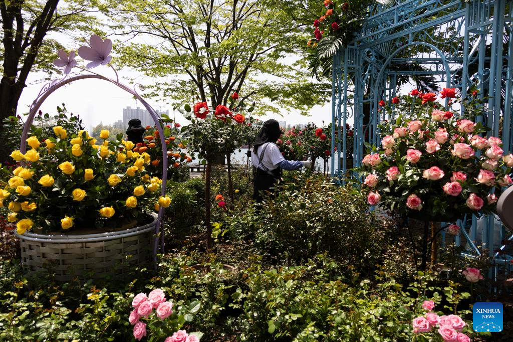 An installation is pictured during a media preview of International Horticulture Goyang Korea, an international flower exhibition, in Goyang, Gyeonggi Province of South Korea, on April 24, 2025. The exhibition will be held from April 25 to May 11 here this year. (Photo by Jun Hyosang/Xinhua)