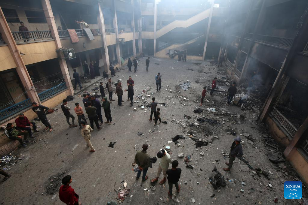 Palestinians are seen at a school after an Israeli airstrike in Gaza City, on April 23, 2025. Israel's Shin Bet domestic security agency and the military said on Wednesday that a deadly overnight airstrike targeting a school sheltering displaced families in northern Gaza was aimed at militants. Gaza's health authorities said the strike killed at least 10 people and caused fires in tents and classrooms at the school. (Photo by Rizek Abdeljawad/Xinhua)