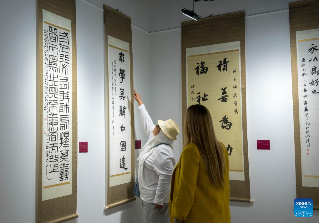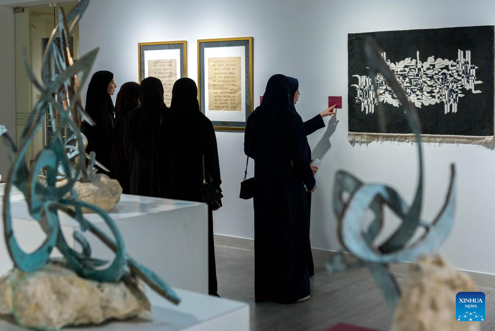 People visit the "Dialogue of Letters Between Qatar and China" calligraphy exhibition at Katara Cultural Village in Doha, Qatar, April 24, 2025. The exhibition opened here on Wednesday, aiming at promoting cultural and art exchanges between the two countries. (Photo by Nikku/Xinhua)