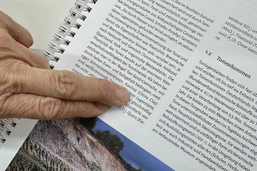 German ceramic artist Karin Flurer-Bruenger shows the German term "Kaoline" written in her book at Taoxichuan Ceramic Art Avenue in Jingdezhen, east China's Jiangxi Province, April 8, 2025. (Xinhua/Du Juanjuan)
