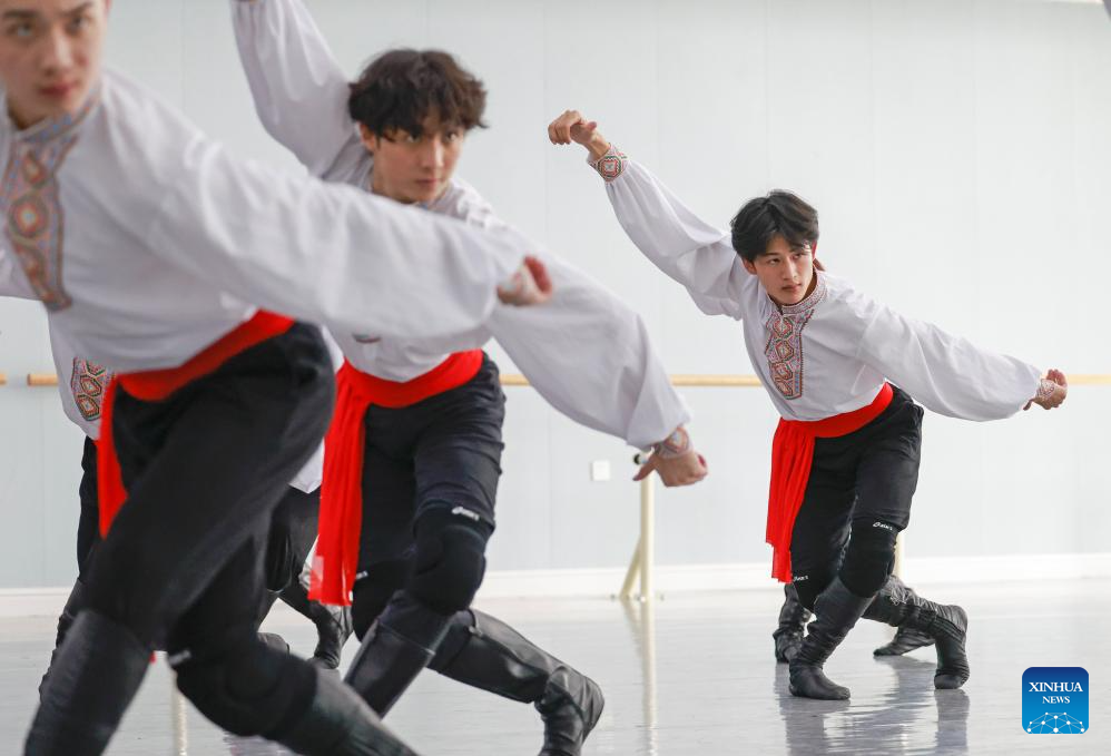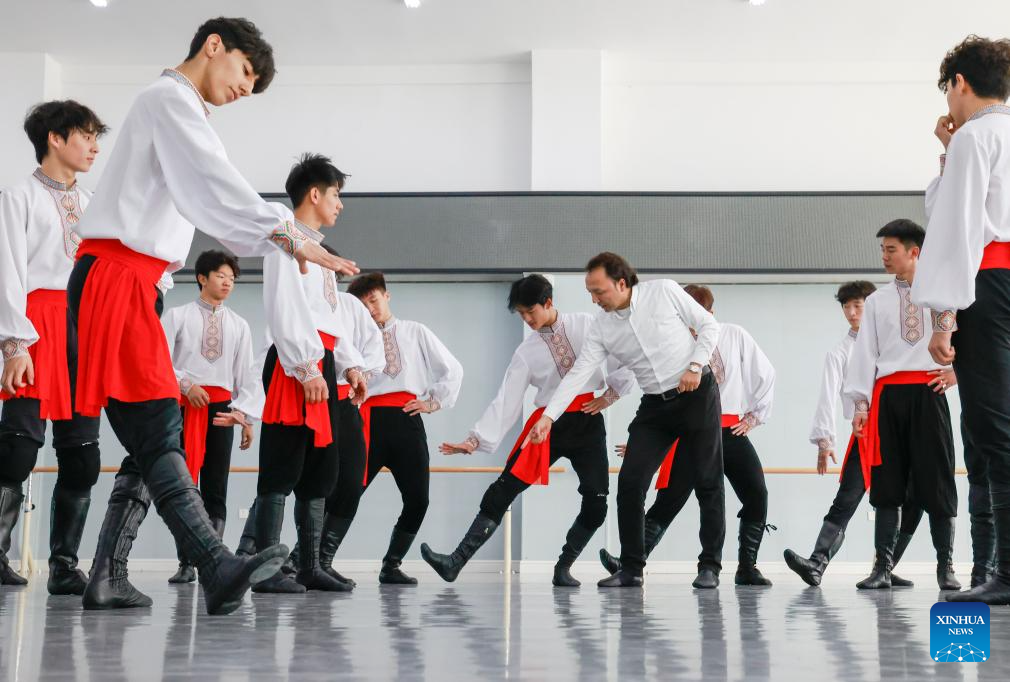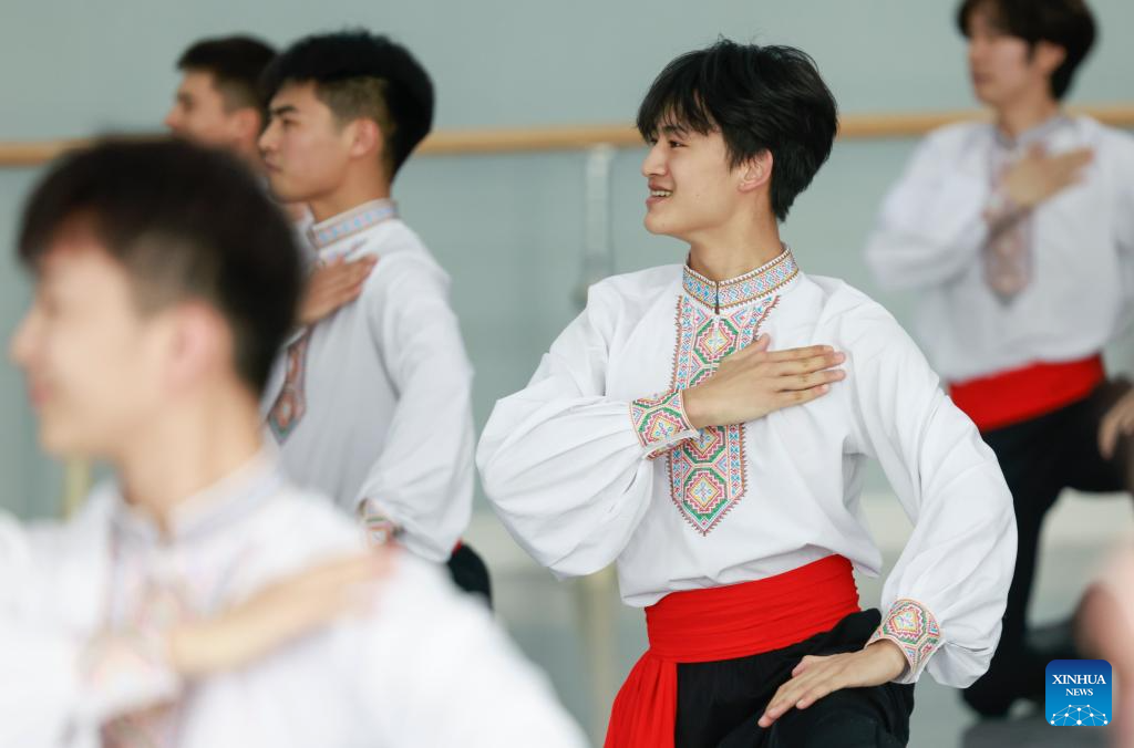 Luo Hao (2nd R) practices Uygur dance at the Dance Academy of Xinjiang Arts University in Urumqi, northwest China's Xinjiang Uygur Autonomous Region, April 14, 2025. (Xinhua/Wang Fei)