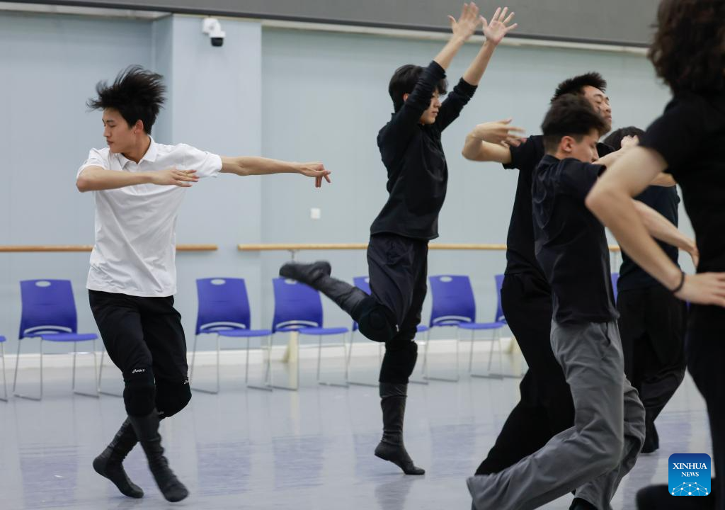 Luo Hao (front) practices Uygur dance at the Dance Academy of Xinjiang Arts University in Urumqi, northwest China's Xinjiang Uygur Autonomous Region, April 14, 2025. (Photo by Xu Rui/Xinhua)