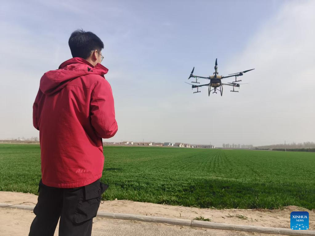 Ding Zehui operates a drone in a field in Ronghe Township of Wanrong County in Yuncheng City, north China's Shanxi Province, March 26, 2025. (Xinhua/Wang Hao)