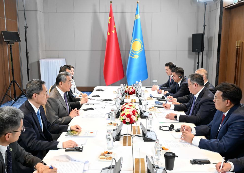 Wang Yi (L), member of the Political Bureau of the Communist Party of China Central Committee and Minister of Foreign Affairs, holds the second China-Kazakhstan Foreign Ministers' strategic dialogue with Murat Nurtleu, Deputy Prime Minister and Minister of Foreign Affairs of Kazakhstan in Almaty, Kazakhstan, on April 25, 2025. (Xinhua/Li Renzi)
