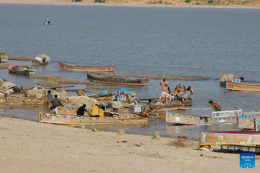 Fishermen boats on the Indus river in the Jamshoro district in Pakistan's southern Sindh province, April 26, 2025. Pakistan on Saturday warned of a full-force response to any attempt by India to divert or block its share of water under the Indus Waters Treaty.(Str/Xinhua)