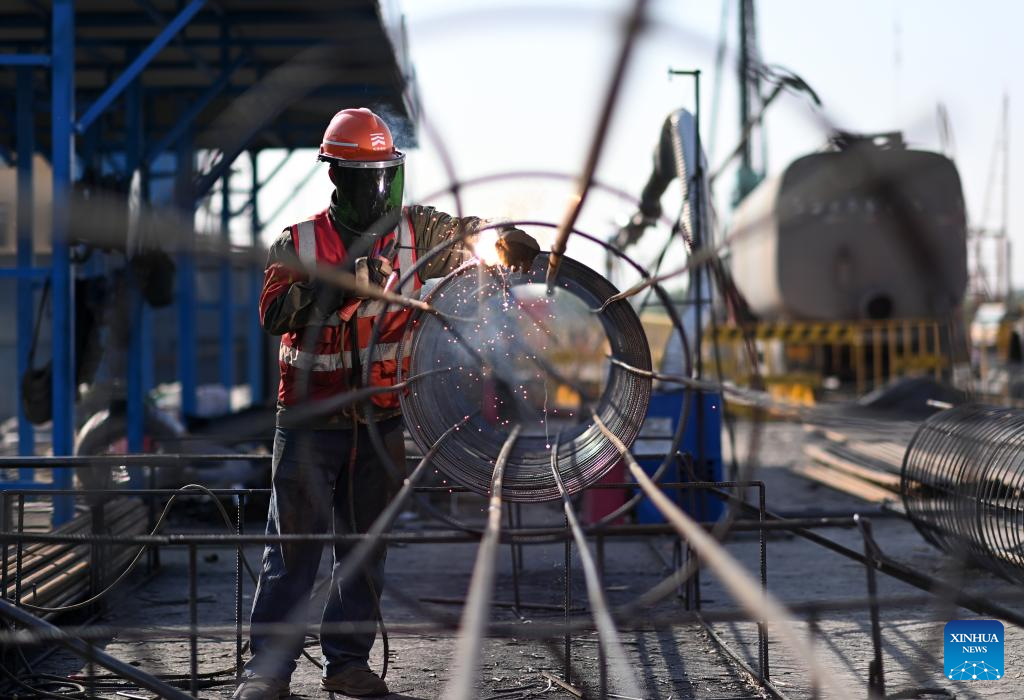 A worker works at the construction site of a new grain silo project of Tianjin Port in north China's Tianjin, April 25, 2025.