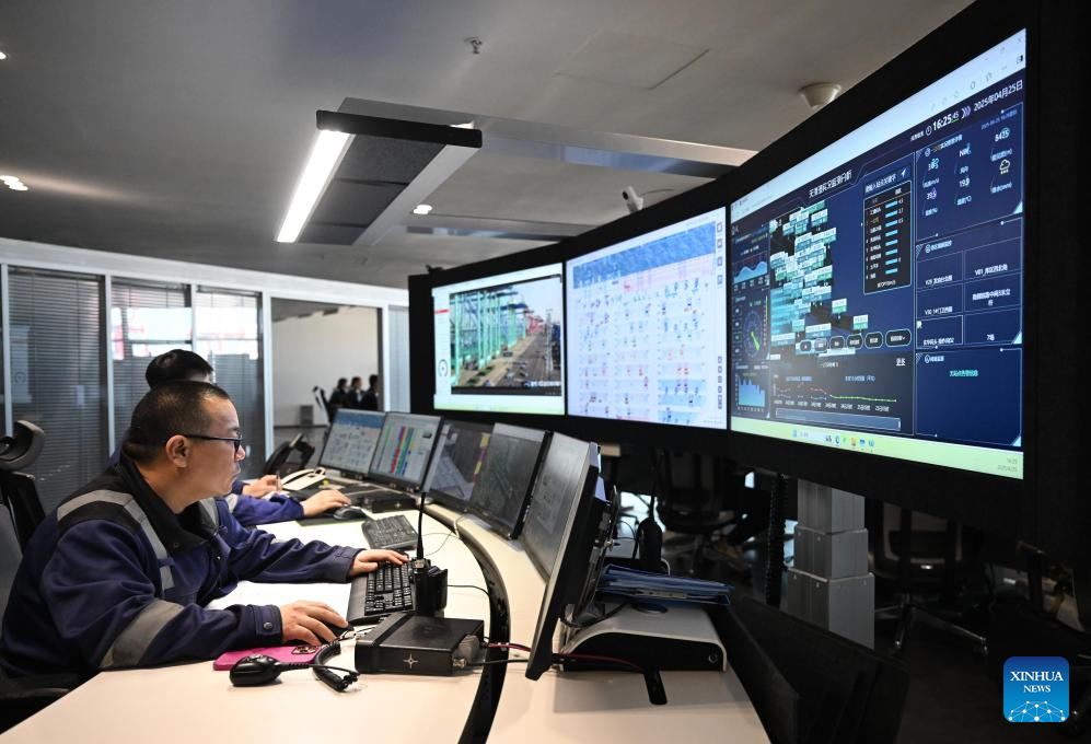 Workers adjust terminal equipment at the intelligent control center of Tianjin Port Second Container Terminal in north China's Tianjin, April 25, 2025.