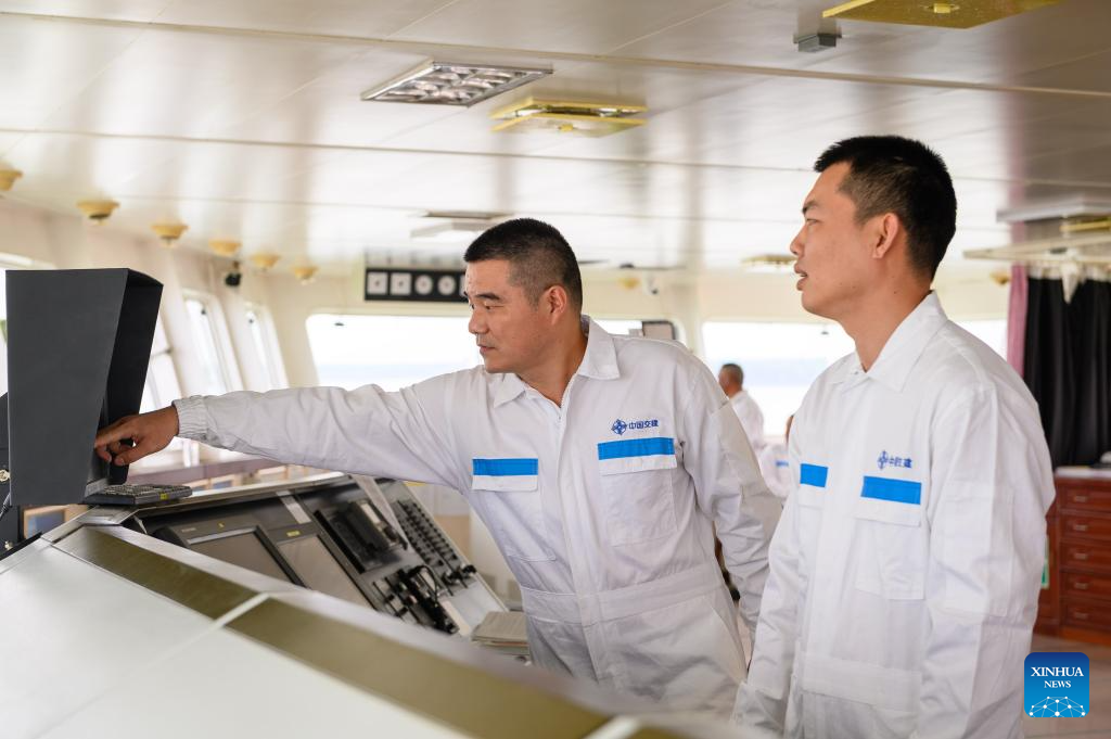 Captain Song Bin (L) works on the bridge of the Chinese dredger "Xin Hai Feng" in Klang, Selangor state, Malaysia, March 13, 2025. The Chinese dredger "Xin Hai Feng" is a trailing suction hopper dredger owned by China Communications Construction Company (CCCC) Shanghai Dredging Co., Ltd., with a hopper capacity of 16,888 cubic meters and a total power of 25,643 kilowatts. It is currently one of the largest dredgers of CCCC Shanghai Dredging Co., Ltd.