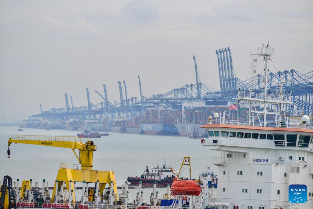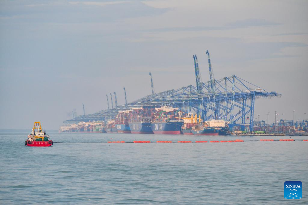 This photo taken on March 13, 2025 shows a view of the Port Klang Free Zone in Klang, Selangor state, Malaysia. The Chinese dredger "Xin Hai Feng" is a trailing suction hopper dredger owned by China Communications Construction Company (CCCC) Shanghai Dredging Co., Ltd., with a hopper capacity of 16,888 cubic meters and a total power of 25,643 kilowatts. It is currently one of the largest dredgers of CCCC Shanghai Dredging Co., Ltd.