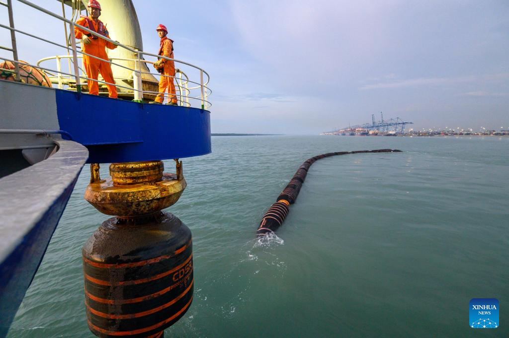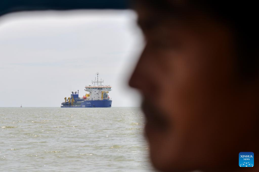 This photo taken on March 13, 2025 shows the filling operation site in Klang, Selangor state, Malaysia. The Chinese dredger "Xin Hai Feng" is a trailing suction hopper dredger owned by China Communications Construction Company (CCCC) Shanghai Dredging Co., Ltd., with a hopper capacity of 16,888 cubic meters and a total power of 25,643 kilowatts. It is currently one of the largest dredgers of CCCC Shanghai Dredging Co., Ltd.