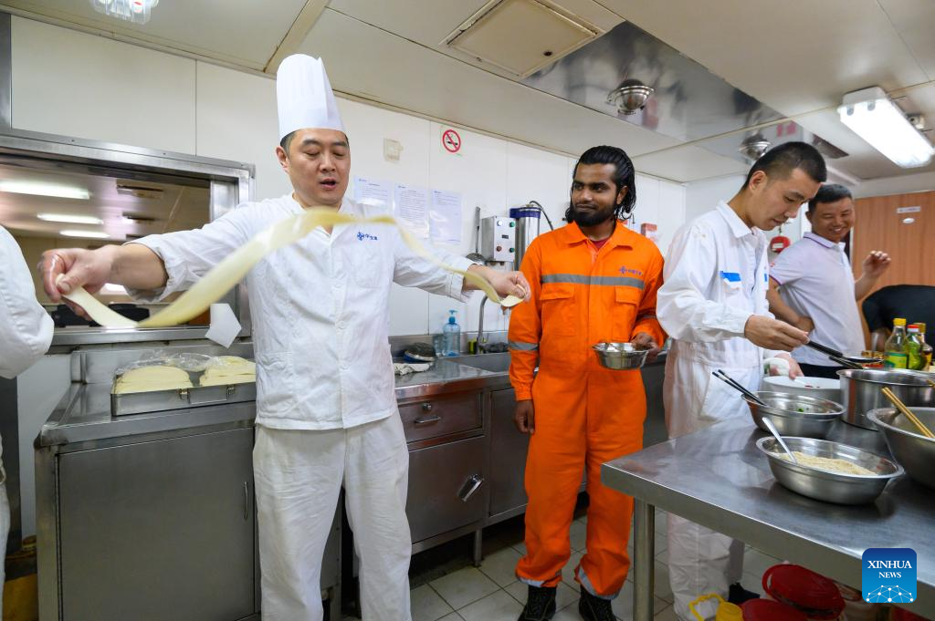 Chefs prepare meals for the crew on the Chinese dredger "Xin Hai Feng" in Klang, Selangor state, Malaysia, March 13, 2025. The Chinese dredger "Xin Hai Feng" is a trailing suction hopper dredger owned by China Communications Construction Company (CCCC) Shanghai Dredging Co., Ltd., with a hopper capacity of 16,888 cubic meters and a total power of 25,643 kilowatts. It is currently one of the largest dredgers of CCCC Shanghai Dredging Co., Ltd.