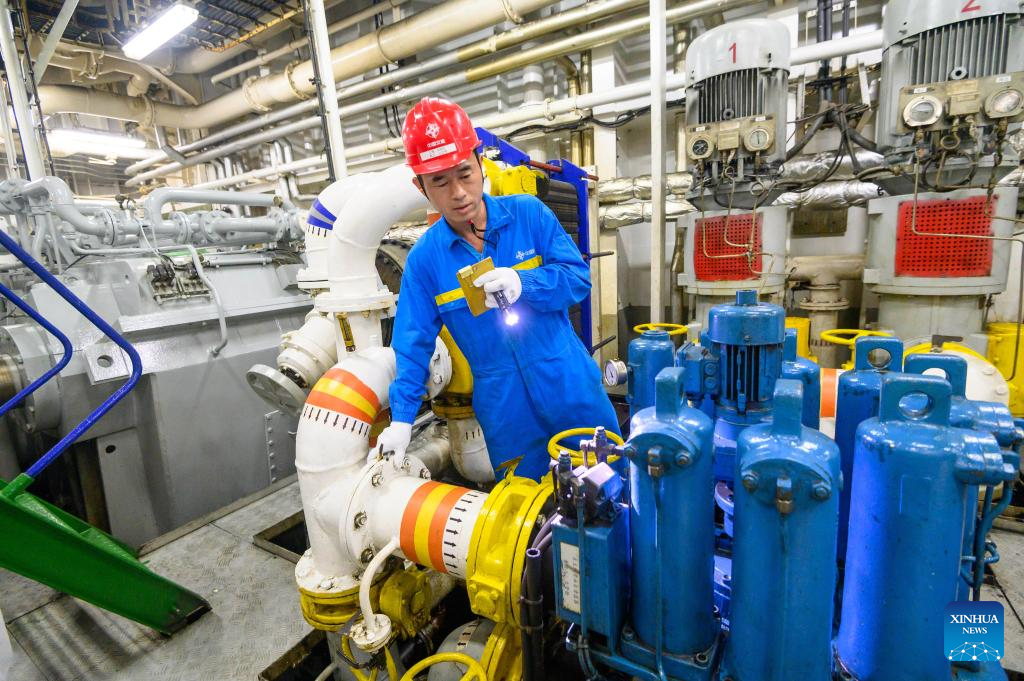 Chief engineer Cai Guohan checks equipment on the Chinese dredger "Xin Hai Feng" in Klang, Selangor state, Malaysia, March 13, 2025. The Chinese dredger "Xin Hai Feng" is a trailing suction hopper dredger owned by China Communications Construction Company (CCCC) Shanghai Dredging Co., Ltd., with a hopper capacity of 16,888 cubic meters and a total power of 25,643 kilowatts. It is currently one of the largest dredgers of CCCC Shanghai Dredging Co., Ltd.