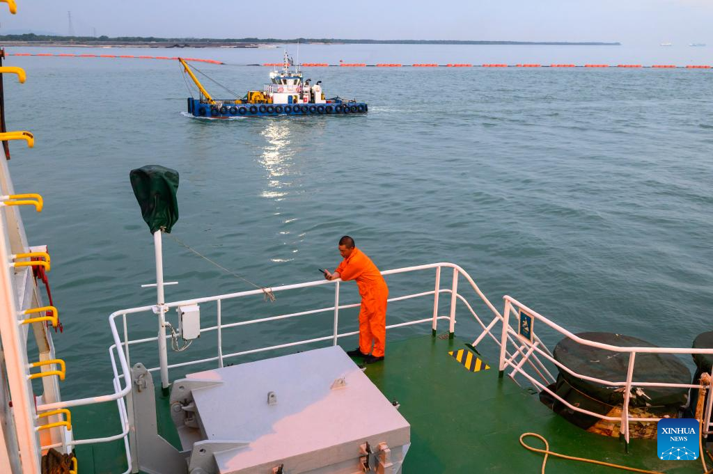 Crew members operate on the Chinese dredger "Xin Hai Feng" in Klang, Selangor state, Malaysia, March 13, 2025. The Chinese dredger "Xin Hai Feng" is a trailing suction hopper dredger owned by China Communications Construction Company (CCCC) Shanghai Dredging Co., Ltd., with a hopper capacity of 16,888 cubic meters and a total power of 25,643 kilowatts. It is currently one of the largest dredgers of CCCC Shanghai Dredging Co., Ltd.
