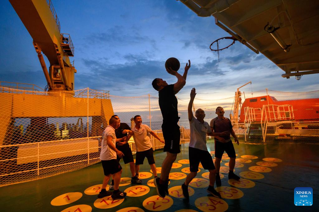 Crew members play basketball on the deck of the Chinese dredger "Xin Hai Feng" in Klang, Selangor state, Malaysia, March 13, 2025. The Chinese dredger "Xin Hai Feng" is a trailing suction hopper dredger owned by China Communications Construction Company (CCCC) Shanghai Dredging Co., Ltd., with a hopper capacity of 16,888 cubic meters and a total power of 25,643 kilowatts. It is currently one of the largest dredgers of CCCC Shanghai Dredging Co., Ltd.