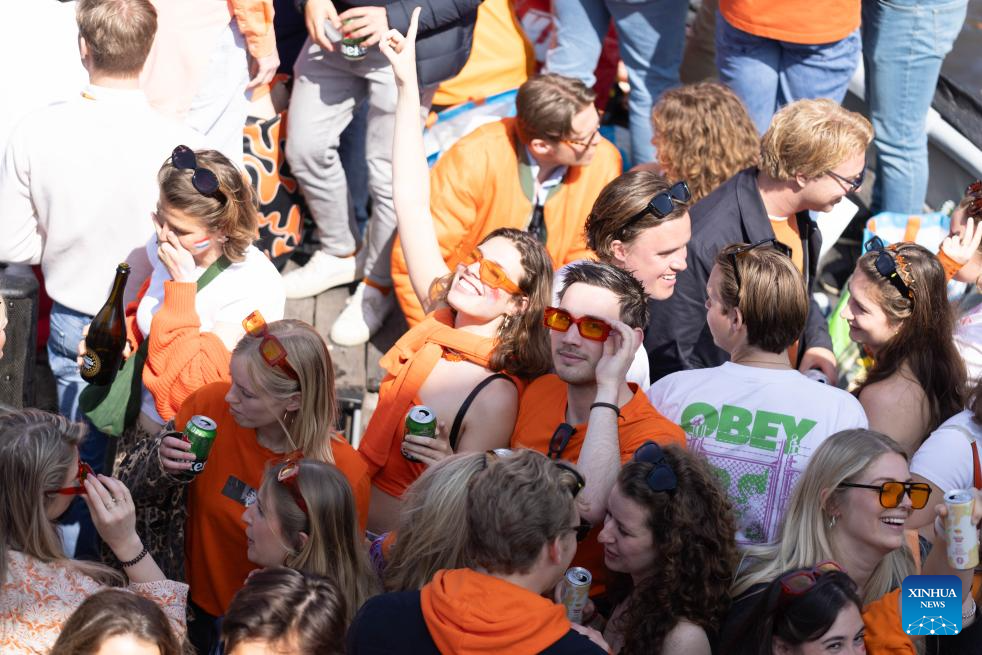 People celebrate King's Day aboard a boat on a canal in Amsterdam, the Netherlands, on April 26, 2025. King's Day is a national holiday in the Kingdom of the Netherlands, celebrated on April 27, King Willem-Alexander's birthday. (Photo by Sylvia Lederer/Xinhua)