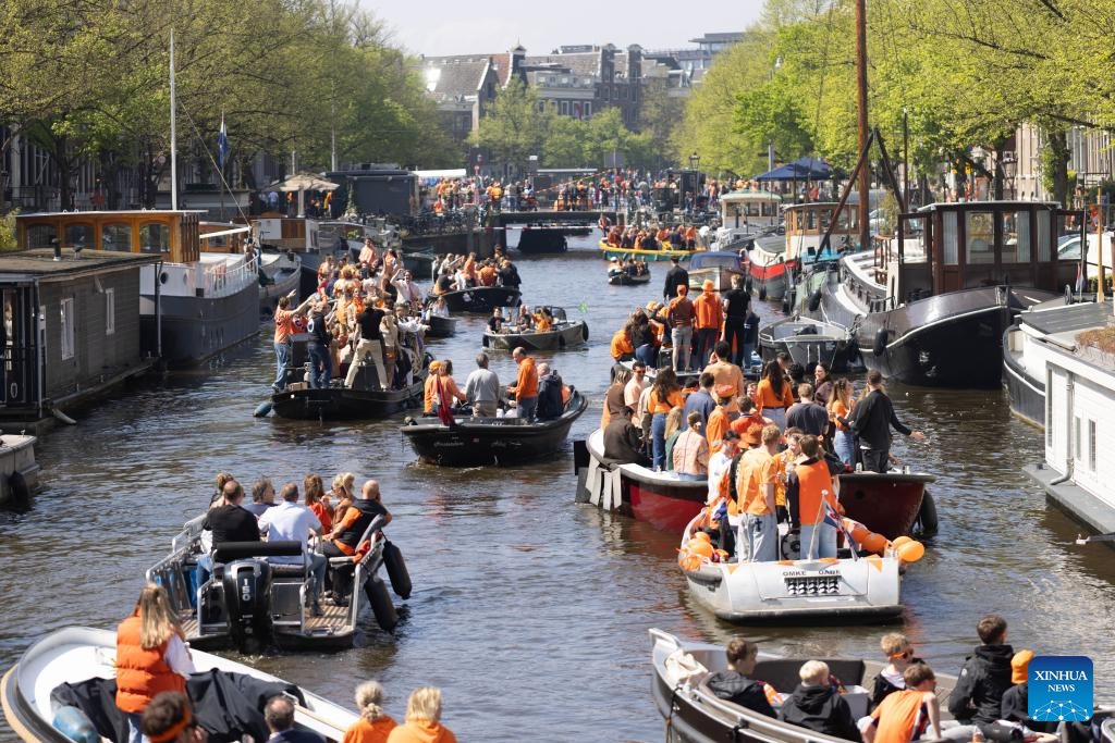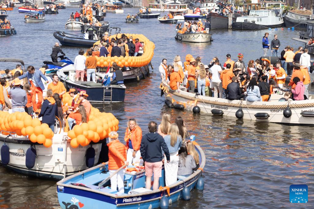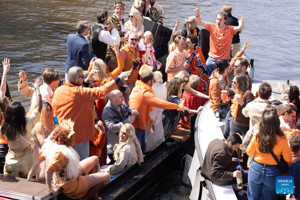 People celebrate King's Day aboard boats on a canal in Amsterdam, the Netherlands, on April 26, 2025. King's Day is a national holiday in the Kingdom of the Netherlands, celebrated on April 27, King Willem-Alexander's birthday. (Photo by Sylvia Lederer/Xinhua)