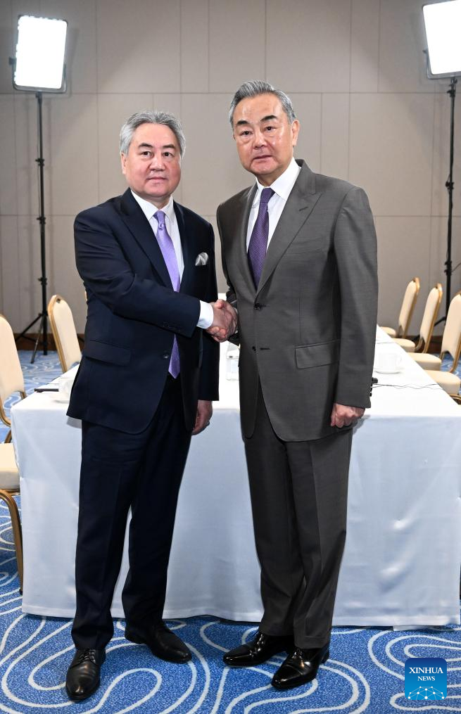 Wang Yi, a member of the Political Bureau of the Communist Party of China Central Committee and Minister of Foreign Affairs, meets with Jeenbek Kulubaev, Minister of Foreign Affairs of Kyrgyzstan, in Almaty, Kazakhstan, April 26, 2025. (Xinhua/Li Renzi)