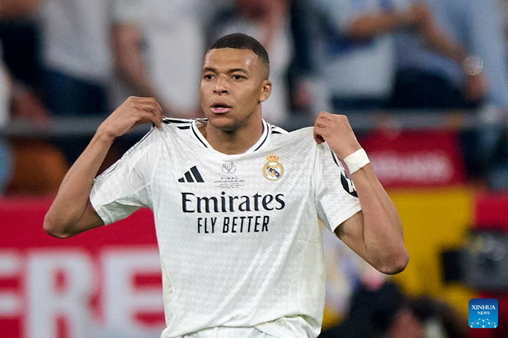 Kylian Mbappe of Real Madrid reacts during the Copa del Rey football match between FC Barcelona and Real Madrid, in La Cartuja Stadium, Seville, Spain, on April 26, 2025. (Photo by Pablo Morano/Xinhua)