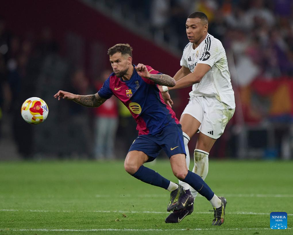 Inigo Martinez (L) of FC Barcelona vies with Kylian Mbappe of Real Madrid during the Copa del Rey football match between FC Barcelona and Real Madrid, in La Cartuja Stadium, Seville, Spain, on April 26, 2025. (Photo by Pablo Morano/Xinhua)