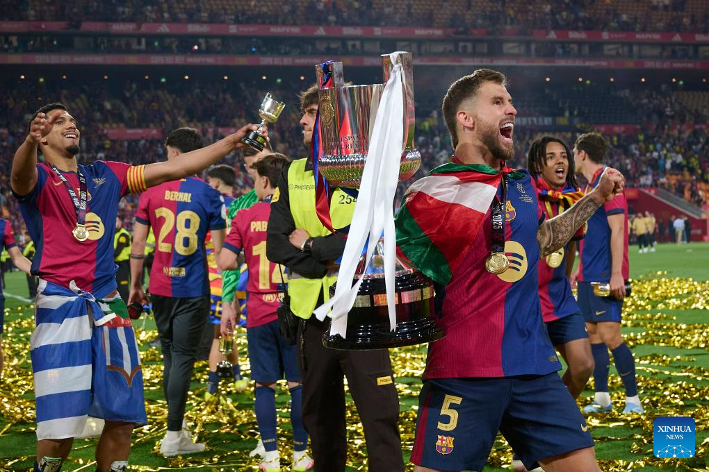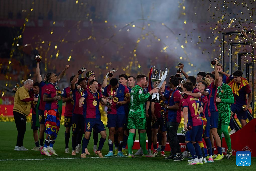 Players of FC Barcelona celebrate with the trophy after the Copa del Rey football match between FC Barcelona and Real Madrid, in La Cartuja Stadium, Seville, Spain, on April 27, 2025. (Photo by Pablo Morano/Xinhua)